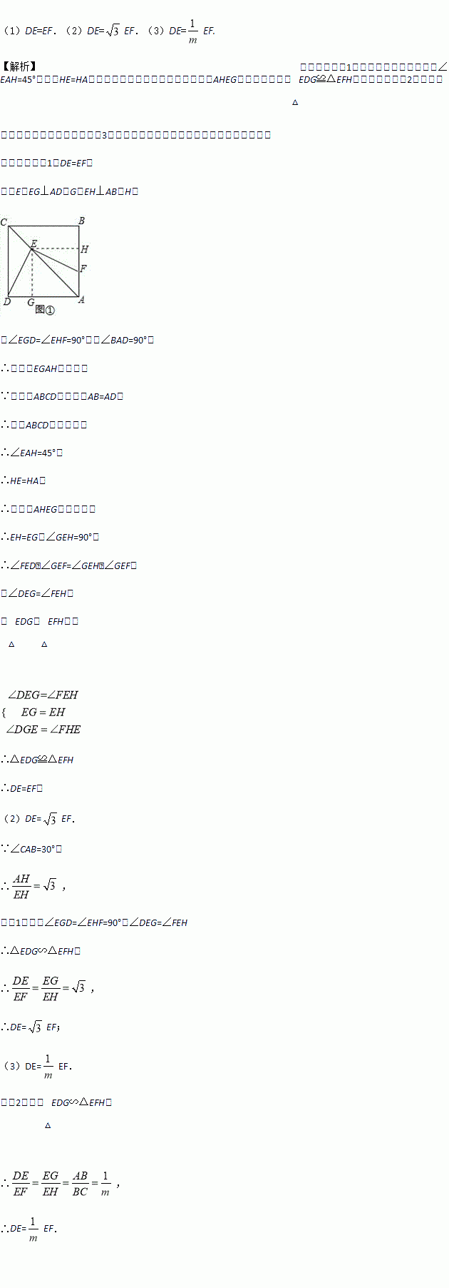 (3)由(1)、(2)这两种特殊情况,小明提出问题:如果在矩形ABCD中,BC=mAB,那DE,EF有什么数量关系?请给出证明.
