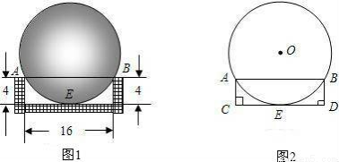 用工件槽(如图1)可以检测一种铁球的大小是否符合要求,已知工件槽的两个底角均为90°,尺寸如图(单位:cm).将形状规则的铁球放入槽内时,若同时具有图1所示的A、B、E三个接触点,该球的大小就符合要求.图2是过球心O及A、B、E三点的截面示意图,求这种铁球的直径.