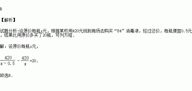 某校用420元钱到商场去购买“84”消毒液,经过还价,每瓶便宜0.5元,结果比用原价多买了20瓶,求原价每瓶多少元?设原价每瓶x元,则可列出方程为( )