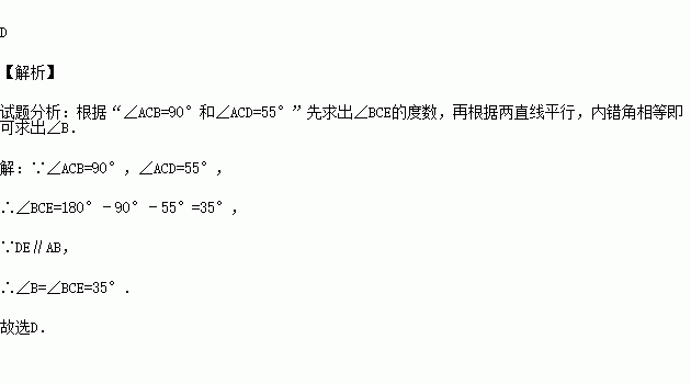 (2012•宿迁模拟)如图,Rt△ABC中,∠ACB=90°,DE过点C,且DE∥AB,若∠ACD=55°,则∠B的度数是( )