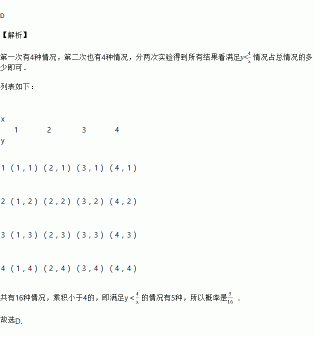 在一个不透明的盒子里,装有四个分别标有数字1、2、3、4的小球,它们的形状、大小、质地等完全相同.小明先从盒子里随机取出一个小球,记下数字为x;放回盒子摇匀后,再由小华随机抽取一个小球,记下数字为y.则小明、小华各取一次小球所确定的数x,y满足y<
