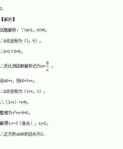 的图象上,OA=1,OC=6,则正方形ADEF的边长为 .