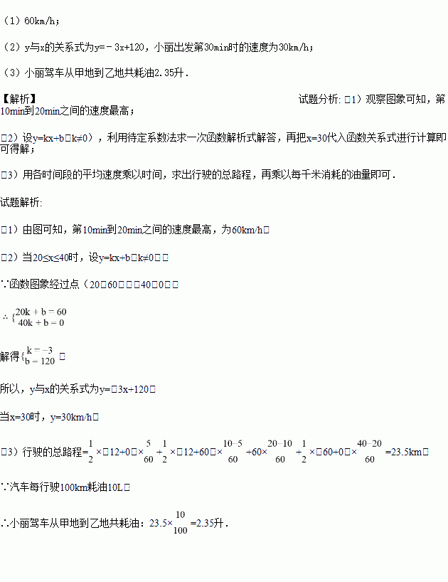 小丽驾车从甲地到乙地.设她出发第xmin时的速度为ykm/h,图中的折线表示她在整个驾车过程中y与x之间的函数关系.