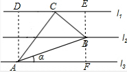 解:如图,过点A作AD⊥l1于D,过点B作BE⊥l1于E,反向延长EB交l3于F,设l1,l2,l3间的距离为1,