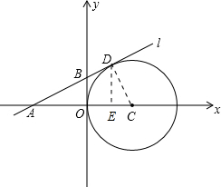 分析 连接CD,由于直线l为⊙C的切线,故CD⊥AD.C点坐标为($\sqrt{3}$,0),故OC=1,即⊙C的半径为1,由点A的坐标为(-$\sqrt{3}$,0),可求出∠CAD=30度.作DE⊥AC于E点,则∠CDE=∠CAD=30°,可求出CE的长,再求点B的坐标为,设直线l的函数解析式为y=kx+b,把A,B两点的坐标代入即可求出未知数的值从而求出其解析式.