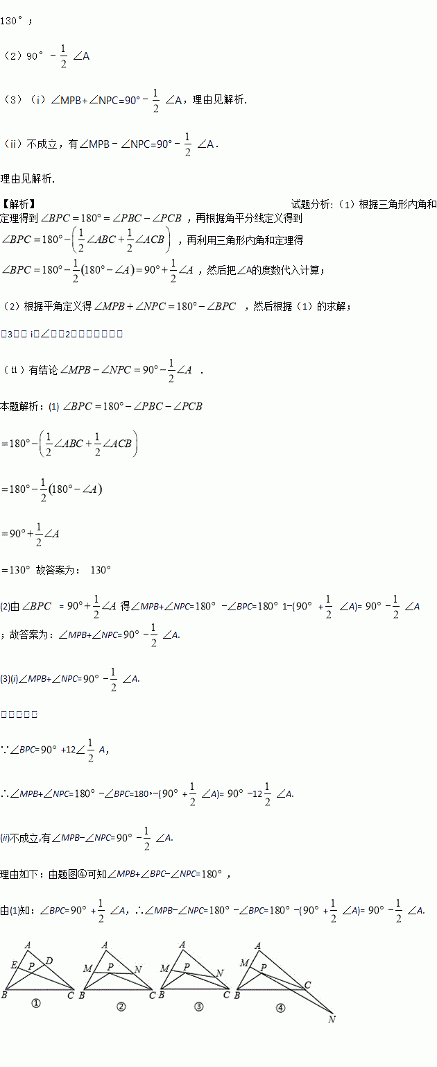 (2)如图②,过点P作直线MN∥BC,分别交AB和AC于点M和N,试求∠MPB+∠NPC的度数(用含∠A的代数式表示) .