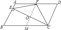 解答 解:取BC的中点M,连接FM,交EC于点O,∵四边形ABCD是平行四边形,∴AD∥BC,AD=BC,∵点F是AD中点,∴AF$\stackrel{∥}{=}$BM,∴四边形ABMF是平行四边形,∵CE⊥AB,∴FM⊥EC,∵BM=MC,∴EO=CO,∴EF=FC.