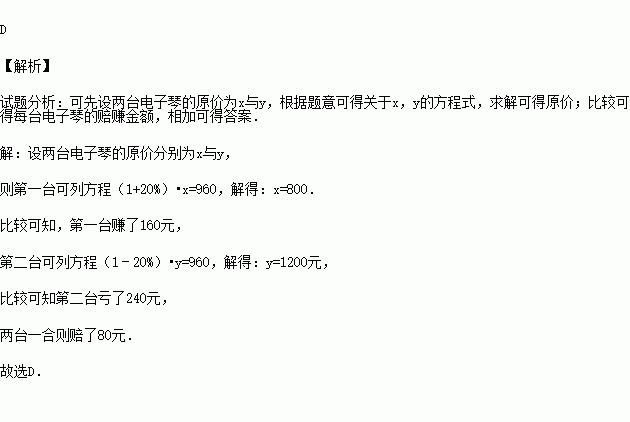 (2001•呼和浩特)某文化商场同时卖出两台电子琴,每台均卖960元.以成本计算,第一台盈利20%,另一台亏本20%.则本次出售中,商场( )