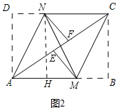 (2)如图2中,作NH⊥AB于H.设DN=NF=x,则CN=4-x,CF=2,在Rt△NFC中,由CN2=CF2+NF2,列出方程求出x,在Rt△MNH中,求出NH、MH,根据MN=$\sqrt{H{N}^{2}+H{M}^{2}}$