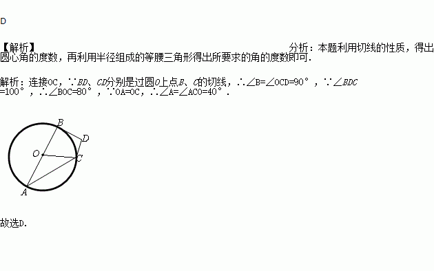 如图,AB是圆O的直径,BD、CD分别是过圆O上点B、C的切线,且∠BDC=100°,连接AC,则∠A的度数为( )