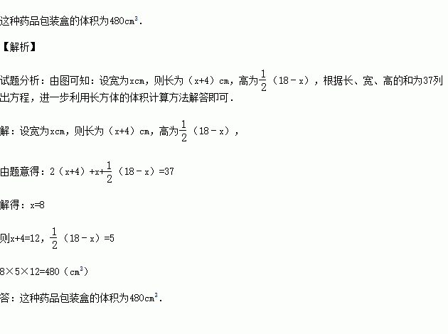 (2015秋•浦口区校级期末)扬子江药业集团生产的某种药品的长方体包装盒的侧面展开图如图所示.根据图中数据,如果长方体盒子的长比宽多4cm,求这种药品包装盒的体积.