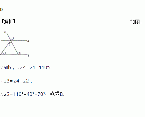 如图,已知直线a,b被直线c所截,若a∥b,∠1=110°,∠2=40°,则∠3=( )