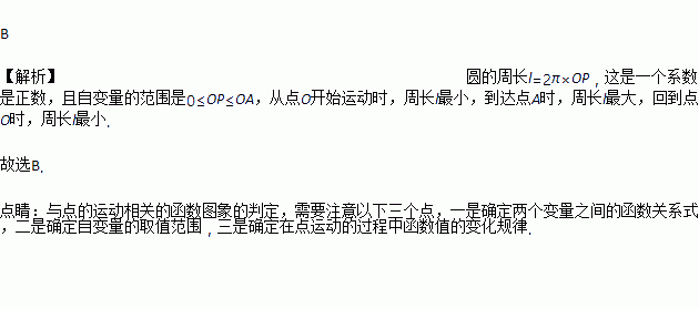 如图,点P是定线段OA上的动点,点P从O点出发,沿线段OA运动至点A后,再立即按原路返回至点O停止,点P在运动过程中速度大小不变,以点O为圆心,线段OP长为半径作圆,则该圆的周长l与点P的运动时间t之间的函数图象大致为( )