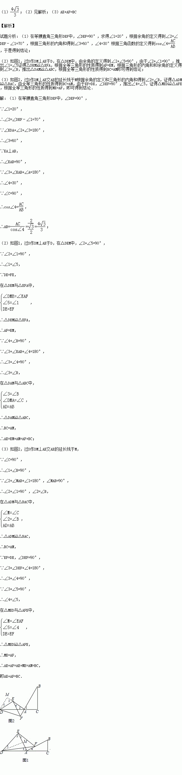 (1)若∠AEF=20°,∠ADE=50°,AC=2,求AB的长度;