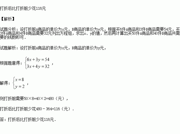 某超市为促销,决定对A,B两种商品进行打折出售.打折前,买6件A商品和3件B商品需要54元,买3件A商品和4件B商品需要32元;打折后,买50件A商品和40件B商品仅需364元,这比打折前少花多少钱?