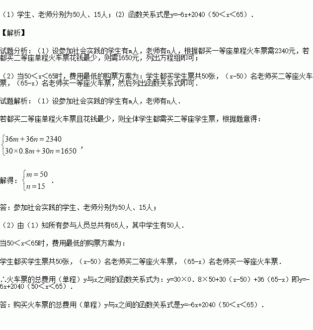 (2)由于各种原因,二等座火车票单程只能买x张(参加社会实践的学生人数<x<参加社会实践的总人数),其余的须买一等座火车票,在保证每位参与人员都有座位坐并且总费用最低的前提下,请你写出购买火车票的总费用(单程)y与x之间的函数关系式.