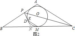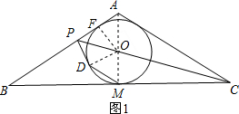 分析 (1)连接AM,根据⊙O是△ABC的内切圆,且AB=AC可得A、O、M 三点共线,AM⊥BC.再由CP是∠ACB的平分线得出∠ACP=∠BCP.设∠BCP=α,由直角三角形的性质可知∠COM=90°-α.∠AOP=∠COM=90°-α.设AB切⊙O于F,连接OF,则OF⊥AB.故∠BAM=90°-2α,根据DM∥AC可用α表示出∠DOM的度数,连接OD,由三角形内角和定理可得出∠POD=90°-3α,故∠FOP=∠DOP.根据SAS定理可得出△FOP≌△DOP,由此可得出结论;