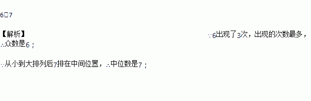 在一次“爱心互助”捐款活动中,某班第一小组7名同学捐款的金额(单位:元)分别为6, 7,6,15,9,6,9.这组数据的众数和中位数分别是________.