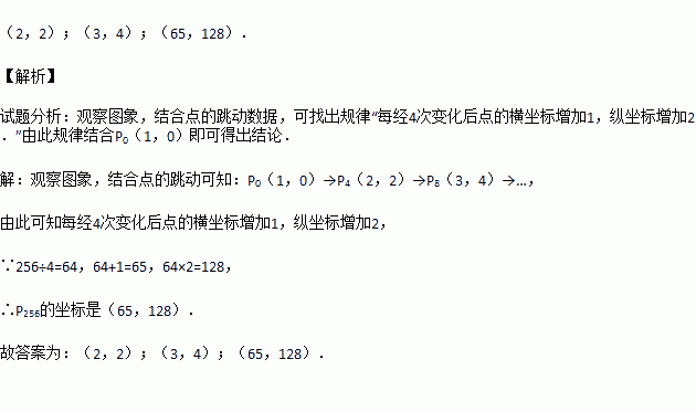 如图,在平面直角坐标系上有个点P(1,0),点P第1次向上跳动1个单位至点P1(1,1),紧接着第2次向左跳动2个单位至点P2(﹣1,1),第3次向上跳动1个单位,第4次向右跳动3个单位,第5次又向上跳动1个单位,第6次向左跳动4个单位,…依此规律跳动下去,P4的坐标是 ,点P第8次跳动至P8的坐标为 ;则点P第256次跳动至P256的坐标是 .