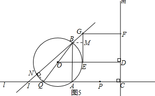 ②连接NQ,由点O到BN的弦心距为l,得NQ=2,当点N在AB的左侧时(如图5),过点B作BM⊥EG于点M,GM=x,BM=x,易得∠GBM=45°,BM∥AQ,易得AI=AB,求得IQ,由NQ得AP;当点N在AB的右侧时(如图6),过点B作BJ⊥GE于点J,由GJ=x,BJ=4x得tan∠GBJ=$\frac{1}{4}$,利用(1)(2)中结论得AI=16x,QI=19x,