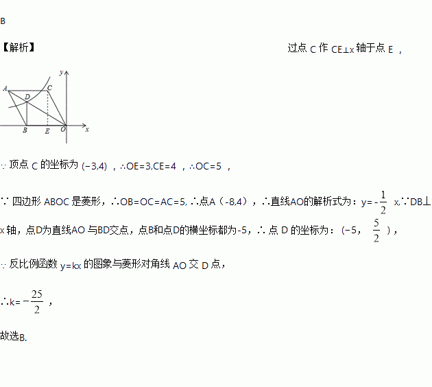 如图,在平面直角坐标系xOy中,菱形ABOC的顶点O在坐标原点,边BO在x轴的负半轴上,顶点C的坐标为(-3,4),反比例函数