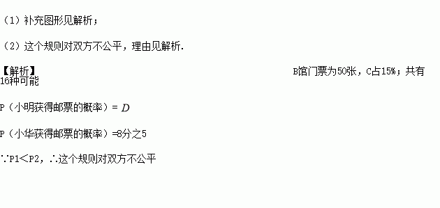 馆门票仅剩下一张,而员工小明和小华都想要,他们决定采用抽扑克牌的方法来确定,规则是:“将同一副牌中正面分别标有数字1,2,3,4的四张牌洗匀后,背面朝上放置在桌面上,每人随机抽一次且一次只抽一张;一人抽后记下数字,不放回再由另一人抽.若小明抽得的数字比小华抽得的数字大,门票给小明,否则给小华.” 请用画树状图或列表的方法计算出小明和小华获得门票的概率,并说明这个规则对双方是否公平.