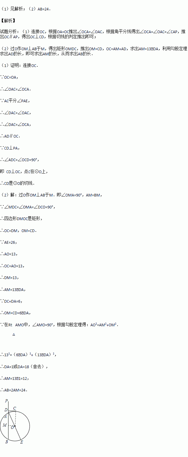 如图,已知直线PA交⊙O于A、B两点,AE是⊙O的直径,点C为⊙O上的一点,且AC平分∠PAE,过C作CD⊥PA于点D.