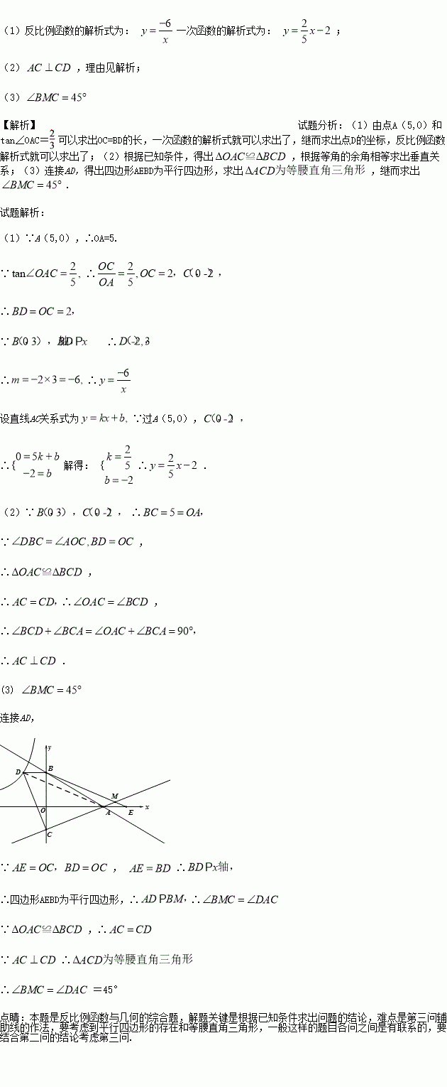 的图象上,过点D作x轴的平行线交y轴于点B(0,3).过点A(5,0)的直线y=kx+b与y轴于点C,且BD=OC,tan∠OAC=