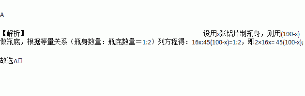 用铝片做听装饮料瓶,现有1OO张铝片,每张铝片可制瓶身16个或制瓶底45个,一个瓶身和两个瓶底可配成一套.设用x张铝片制瓶身,则下面所列方程正确的是( )