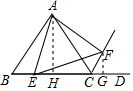 分析 过A作AH⊥BC于H,根据等边三角形的性质得到AH=2$\sqrt{3}$,求得S△ABC=$\frac{1}{2}×$4×2$\sqrt{3}$=4$\sqrt{3}$,根据旋转的性质得到∠EAF=∠BAC=60°,根据全等三角形的性质得到CF=BE=x,过F作FG⊥BD于G,求得FG=$\frac{\sqrt{3}}{2}$x,推出S四边形AECF=S△ABC=4$\sqrt{3}$,于是得到结论.