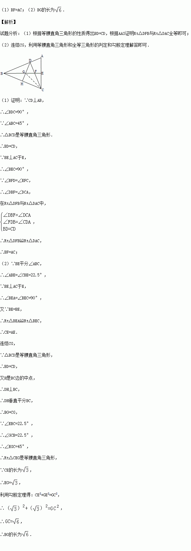 (2015秋•怀柔区期末)已知:如图,△ABC中,∠ABC=45°,CD⊥AB于D,BE平分∠ABC,且BE⊥AC于E,与CD相交于点F,H是BC边的中点,连结DH与BE相交于点G.