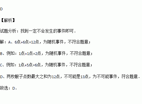 同时掷两枚质地均匀的正方体骰子,骰子的六个面上分别刻有1到6的点数,下列事件中是不可能事件的是( )