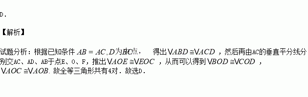 如图,△ABC中,AB=AC,D是BC的中点,AC的垂直平分线分别交AC、AD、AB于点E、O、F,则图中全等三角形的对数是( )