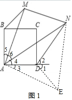 分析 (1)如图1,将△ABM绕点A顺时针旋转90°后得到△ADE,根据正方形的性质和角平分线的定义得出∠NDE=360°-∠ADN-∠ADE=90°,再结合旋转的性质知BM=DE,证△MAN≌△DAN得MN=NE,在Rt△DEN中由DN2+DE2=EN2可得答案;