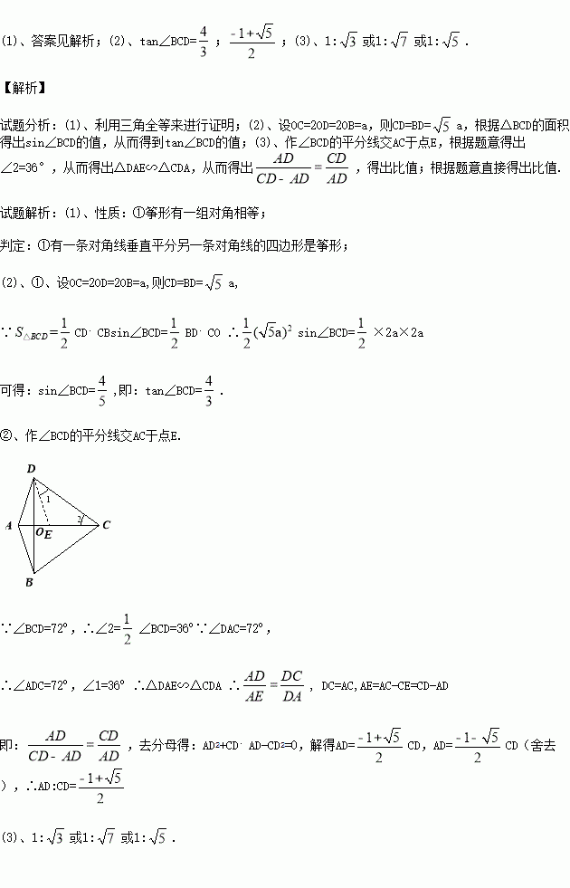 (2)、筝型ABCD中,对角线AC,BD相交于点O.