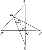 AB,可得CE=MC,CF=MC,从而得到∠1=∠E,∠2=∠F,再利用三角形内角与外角的关系可得∠1+∠E=∠4,∠2+∠F=∠3,进而得到∠1=