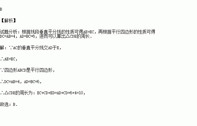 如图,在平行四边形ABCD中,AB=4,BC=6,AC的垂直平分线交AD于点E,则△CDE的周长是( )