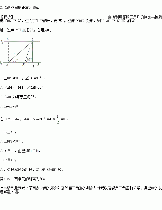 如图,河的两岸l1与l2相互平行,A、B是l1上的两点,C、D是l2上的两点,某人在点A处测得∠CAB=90°,∠DAB=30°,再沿AB方向前进20米到达点E(点E在线段AB上),测得∠DEB=60°,求C、D两点间的距离.