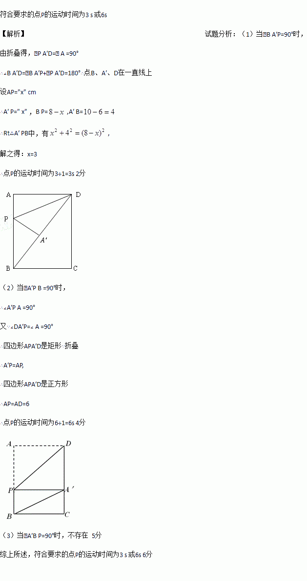 如图,矩形ABCD中,AB=8cm,BC=6cm,动点P从点A出发,以每秒3cm的速度沿线段AB向点B运动,连接DP,把∠A沿DP折叠,使点A落在点A′ 处.求出当△BPA′ 为直角三角形时,AP=______________cm.
