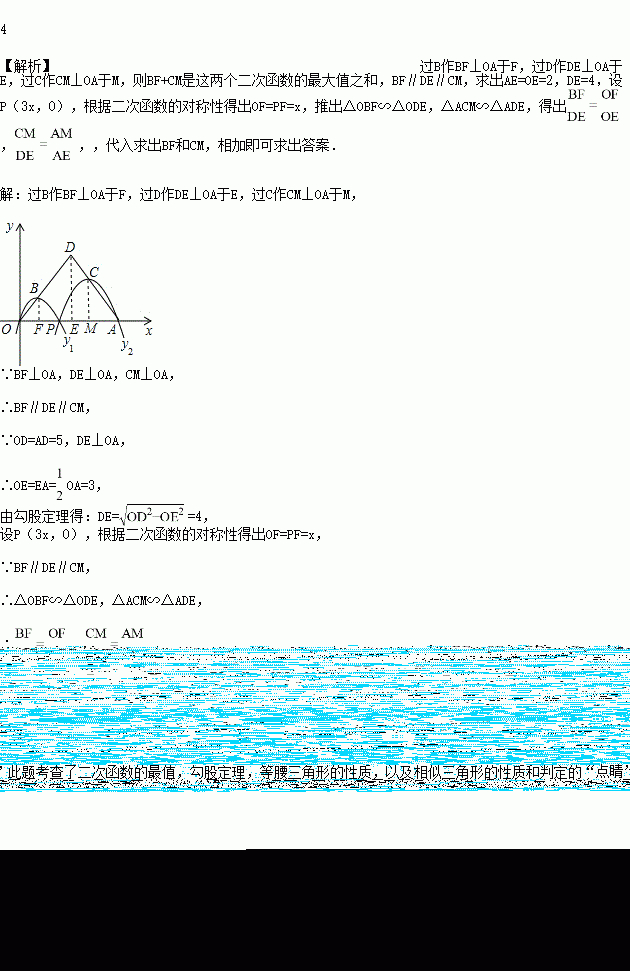 如图,已知点A(6,0),O为坐标原点,P是线段OA上任意一点(不含端点O,A),过P、O两点的二次函数y1和过P、A两点的二次函数y2的图象开口均向下,它们的顶点分别为B、C,射线OB与AC相交于点D.当OD=AD=5时,这两个二次函数的最大值之和等于______________。