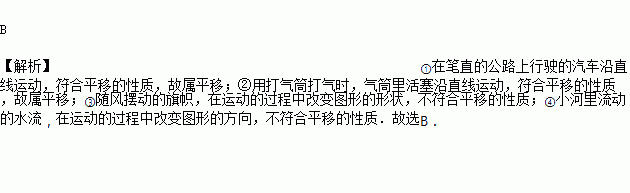 在以下现象中:①在笔直的公路上行驶的汽车;②用打气筒给自行车打气时,气筒里活塞的运动;③随风摆动的旗帜;④小河里流动的水流.属于平移的是( )