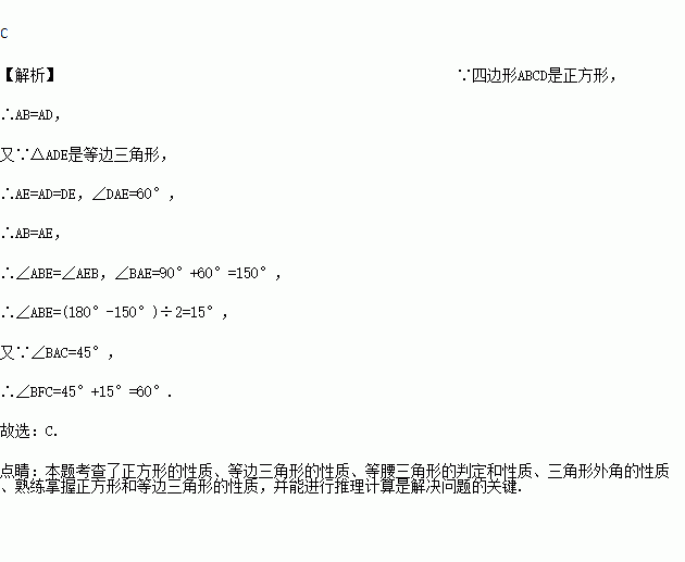 如图所示,在正方形 ABCD的外侧,作等边三角形 ADE,AC,BE相交于点F,则∠BFC的度数为( )