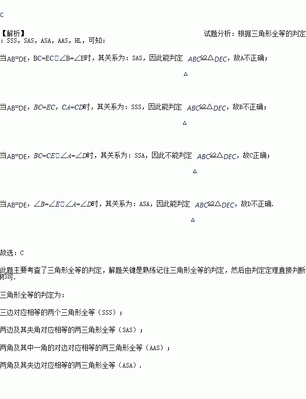 A. BC=EC,∠B=∠E B. BC=EC,CA=CD C. BC=CE,∠A=∠D D. ∠B=∠E,∠A=∠D