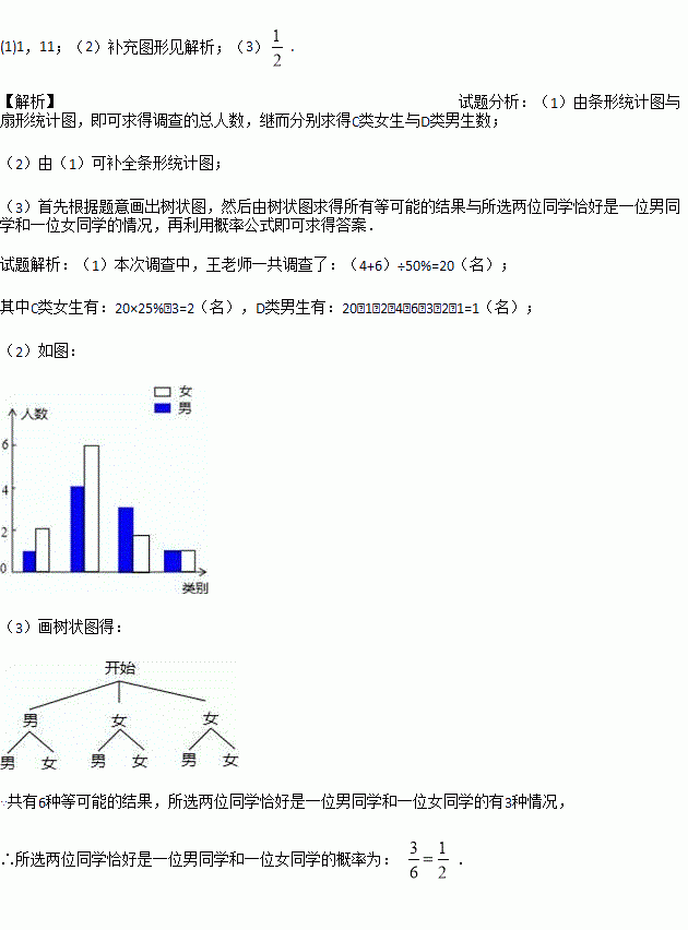 (3)为了共同进步,张老师想从被调查的A类和D类学生中分别选取一位同学进行“一帮一”互助学习,请用列表法或画树形图的方法求出所选两位同学恰好是一位男同学和一位女同学的概率.