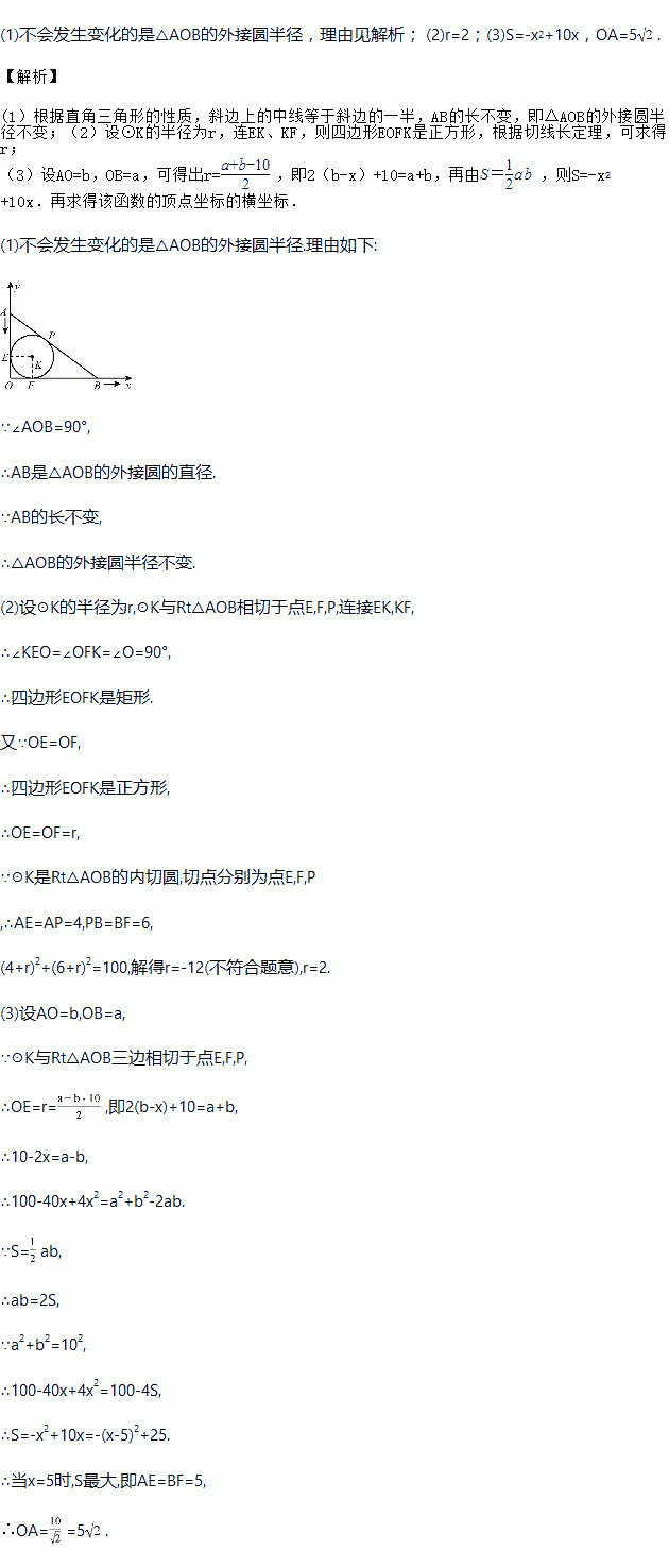 (1)在上述变化过程中,Rt△AOB的周长,☉K的半径,△AOB外接圆半径,这几个量中不会发生变化的是什么?并简要说明理由.