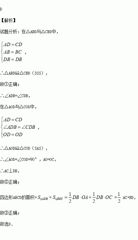 两组邻边分别相等的四边形叫做“筝形”,如图,四边形ABCD是一个筝形,其中AD=CD,AB=CB,在探究筝形的性质时,得到如下结论:①△ABD≌△CBD;②AC⊥BD;③四边形ABCD的面积=