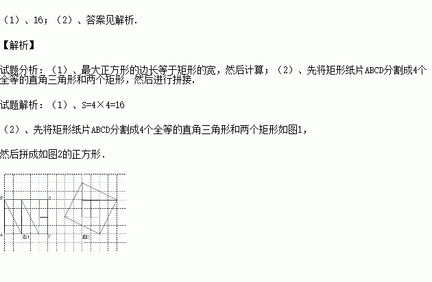 (2)请用矩形纸片ABCD剪拼成一个面积最大的正方形.要求:在图2的矩形ABCD中画出裁剪线,并在网格中画出用裁剪出的纸片拼成的正方形示意图(使正方形的顶点都在网格的格点上).