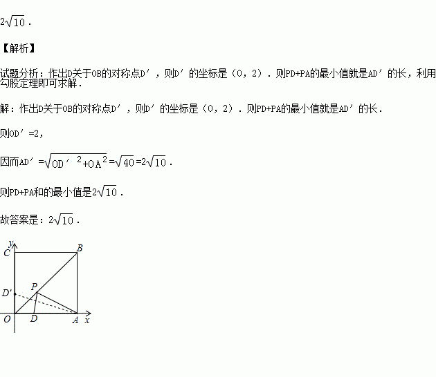 如图,已知四边形OABC为正方形,边长为6,点A、C分别在x轴、y轴的正半轴上,点D在OA上,且点D的坐标为(2,0),点P是OB上的一个动点,则PD+PA的最小值是 .