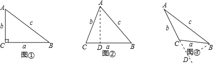 分析 如图②中,△ABC是锐角三角形,过点A作AD⊥BC,垂足为D,设CD为x,根据AD不变由勾股定理得出等式b2-x2=AD2=c2-(a-x)2,化简即可;如图③中,△ABC是钝角三角形,过B作BD⊥AC,交AC的延长线于D.设CD为x,根据勾股定理,得(b+x)2+a2-x2=c2,化简即可.