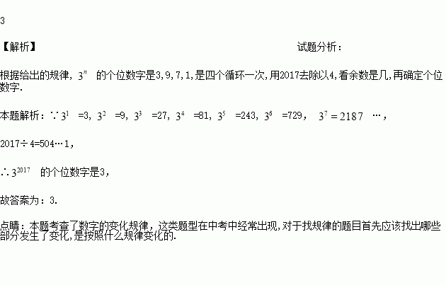 观察下列等式:31=3,32=9,33=27,34=81,35=243,36=729,…,试猜想,32017的个位数字是__________.